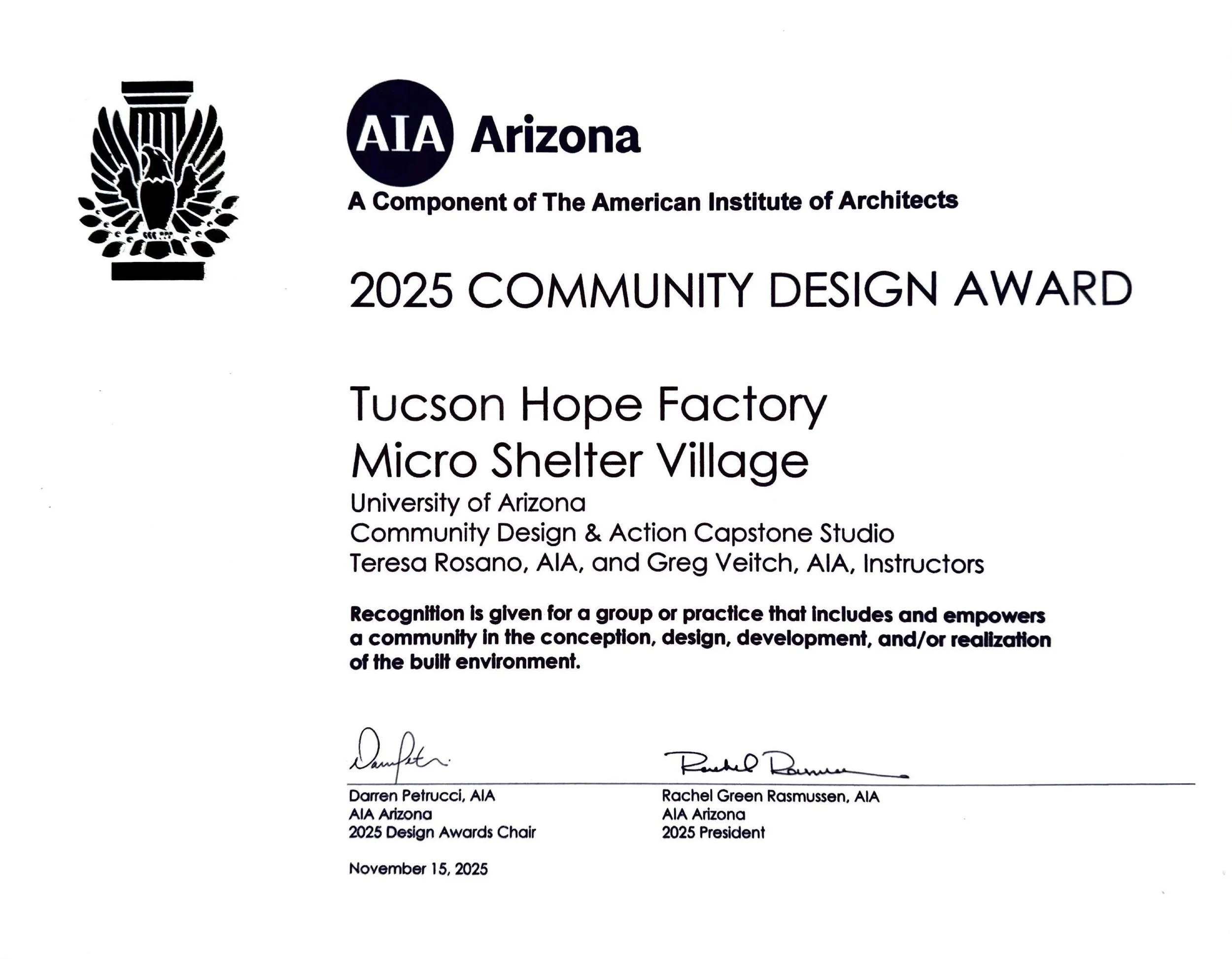The Tucson Hope Factory (THF) was established in 2024 to lead volunteers in building micro shelters and placing them within well-managed villages in Tucson and Pima County. THF strives to create a safe and supportive living environment, empowering individuals and families experiencing homelessness to rebuild their lives with dignity and stability.